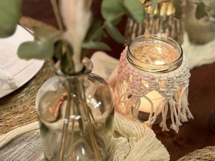 Das Windlicht Makramee ist eine charmante und natürliche Ergänzung für jede Veranstaltung, die mit seiner kunstvollen Handwerksoptik einen warmen, bohemian Stil vermittelt. Der Glasbehälter ist mit einem fein geknüpften Makramee-Überzug versehen, der das Kerzenlicht sanft durchscheinen lässt und dabei ein weiches, romantisches Lichtspiel erzeugt.